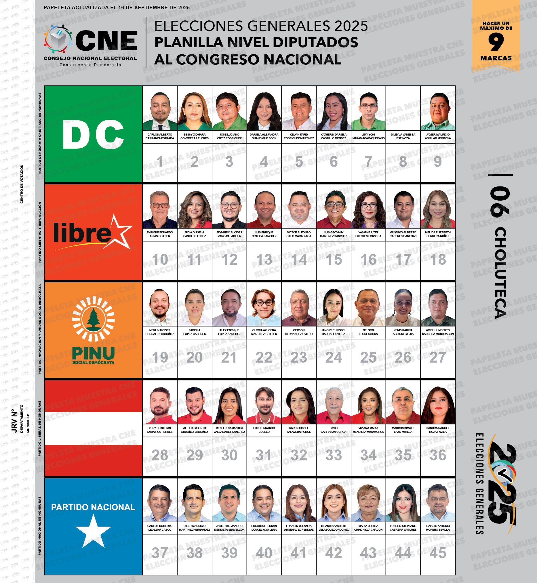 Choluteca Mapa interactivo 0 Carga electoral Electores habilitados para ejercer el sufragio. Porcentaje de electores que votaron en 2021 (para nivel presidencial): 74.5% 9 Diputados a elegir en el departamento. Papeleta electoral Actualizada al 16 de septiembre. Datos destacados: Los diputados de este departamento están distribuidos así:3 de Partido Libre4 de Partido Nacional2 de Partido Liberal Es el departamento con mayor carga electoral.