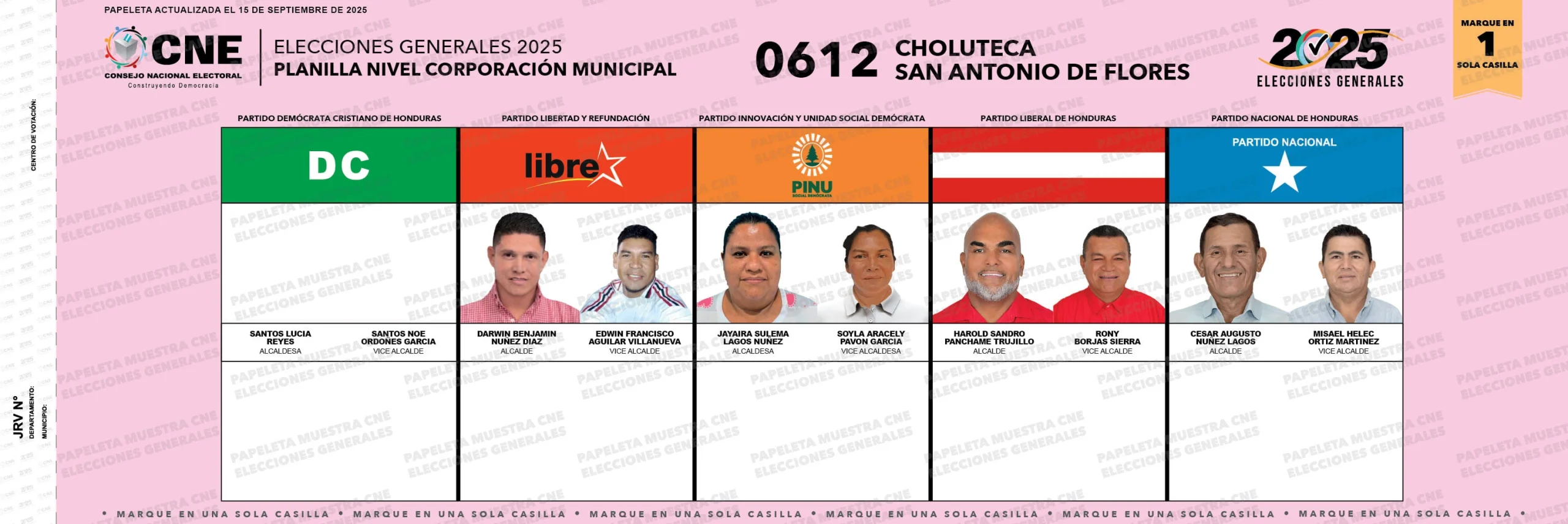 0 Carga electoral Electores habilitados para ejercer el sufragio. Porcentaje de electores que votaron en 2021 (para nivel presidencial): 88.46% La alcaldía fue ganada por el Partido Nacional (2021). Papeleta electoral Actualizado al 16 de septiembre. Datos destacados: 0612 Código del municipio.