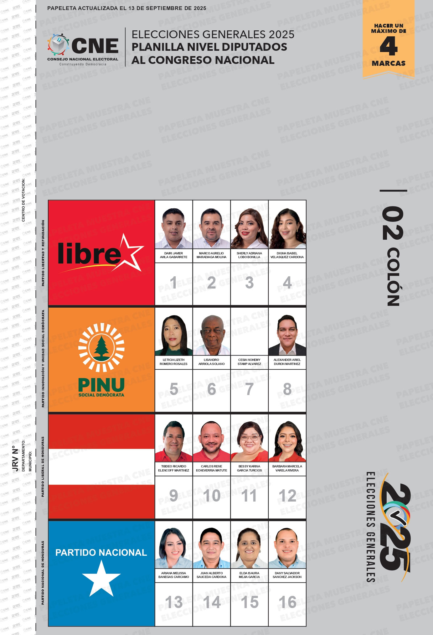 Colón Mapa interactivo 0 Carga electoral Electores habilitados para ejercer el sufragio. Porcentaje de electores que votaron en 2021 (para nivel presidencial): 63.1% 4 Diputados a elegir en el departamento. Papeleta electoral Actualizado al 13 de septiembre. Datos destacados: Los diputados de este departamento están distribuidos así:2 de Partido Libre1 de Partido Nacional1 de Partido Liberal Es el departamento con mayor carga electoral.