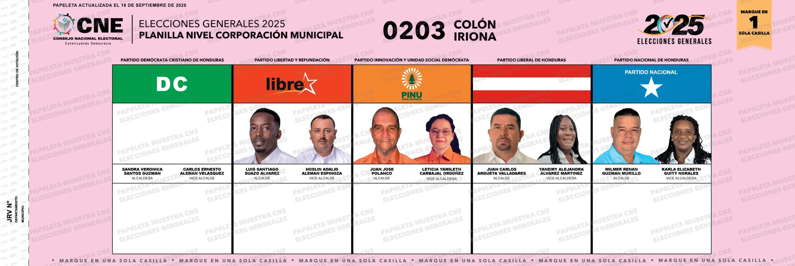 0 Carga electoral Electores habilitados para ejercer el sufragio. Porcentaje de electores que votaron en 2021 (para nivel presidencial): 54.41% La alcaldía fue ganada por el Partido Nacional (2021). Papeleta electoral Actualizado al 16 de septiembre. Datos destacados: 0203 Código del municipio.