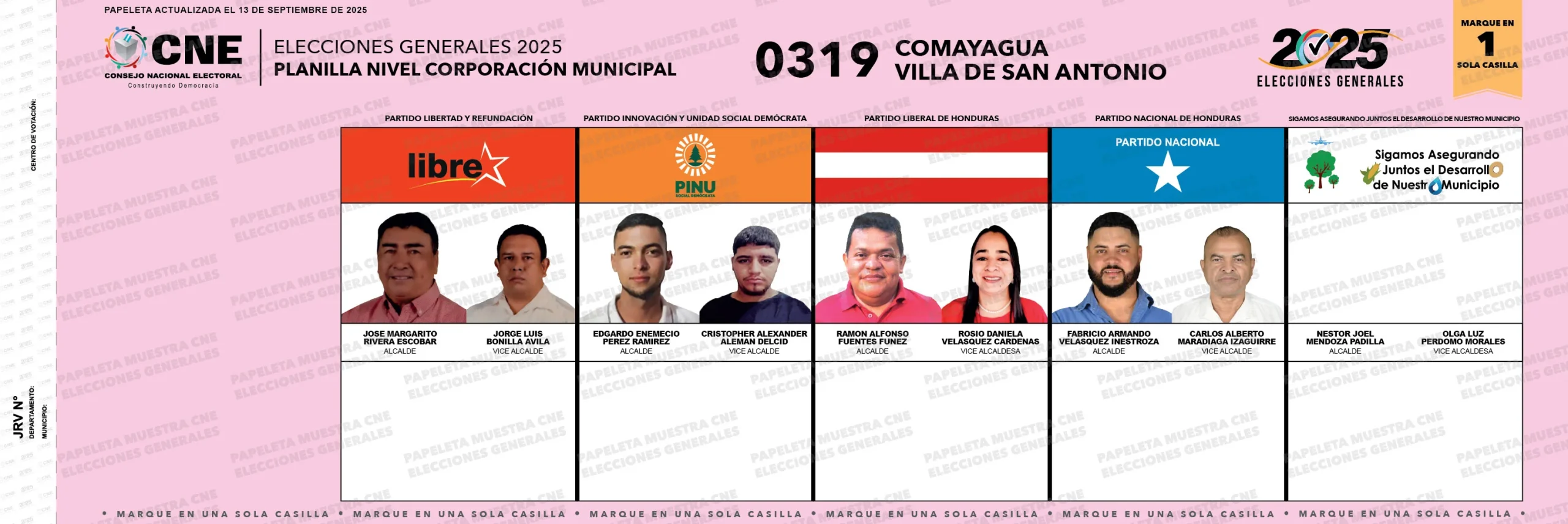 0 Carga electoral Electores habilitados para ejercer el sufragio. Porcentaje de electores que votaron en 2021 (para nivel presidencial): 65.44% La alcaldía fue ganada por el Partido Sigamos Desarrollando Juntos Nuestro Municipio (2021). Papeleta electoral Actualizado al 13 de septiembre. Datos destacados: 0319 Código del municipio.