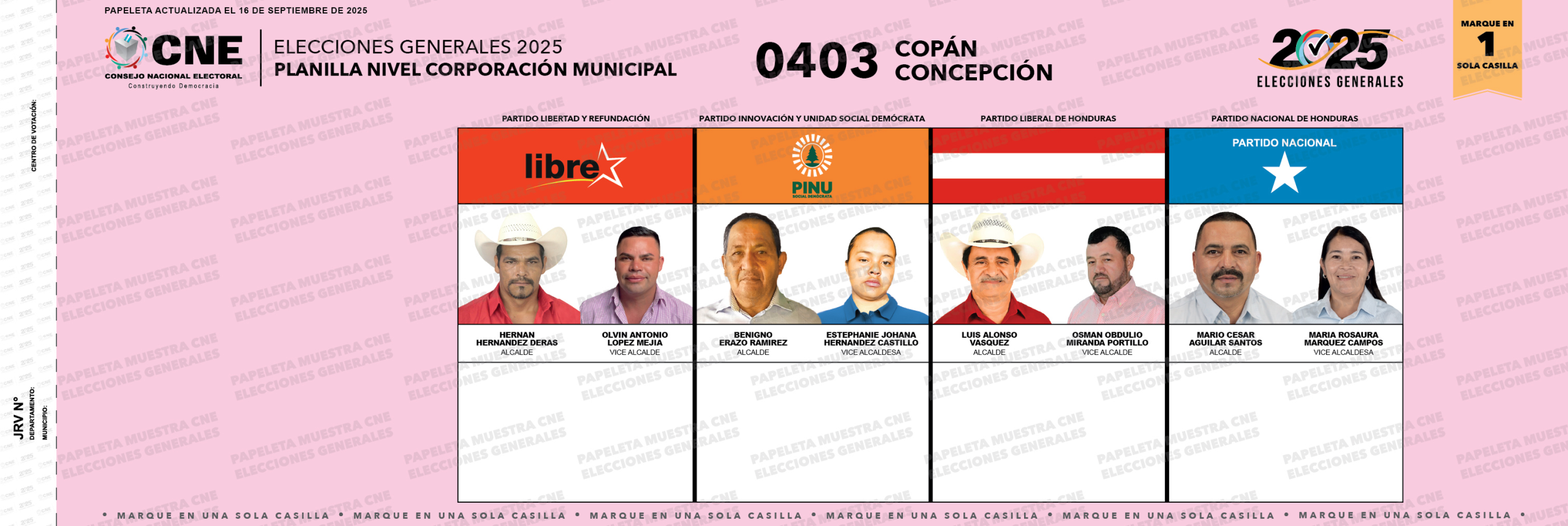0 Carga electoral Electores habilitados para ejercer el sufragio. Porcentaje de electores que votaron en 2021 (para nivel presidencial): 83.98% La alcaldía fue ganada por el Partido Nacional (2021). Papeleta electoral Actualizado al 16 de septiembre. Datos destacados: 0403 Código del municipio.