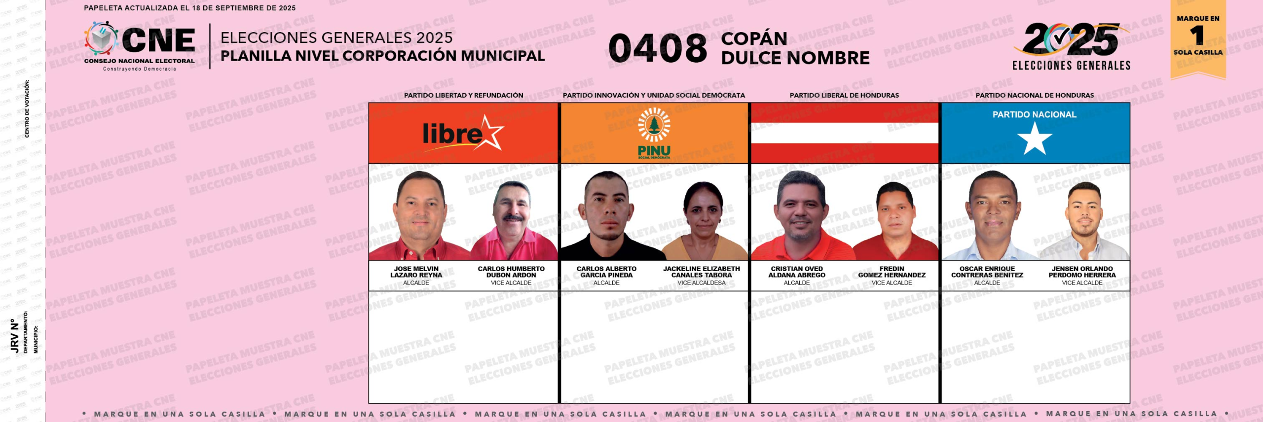 0 Carga electoral Electores habilitados para ejercer el sufragio. Porcentaje de electores que votaron en 2021 (para nivel presidencial): 83.60% La alcaldía fue ganada por el Partido Nacional (2021). Papeleta electoral Actualizado al 16 de septiembre. Datos destacados: 0408 Código del municipio.