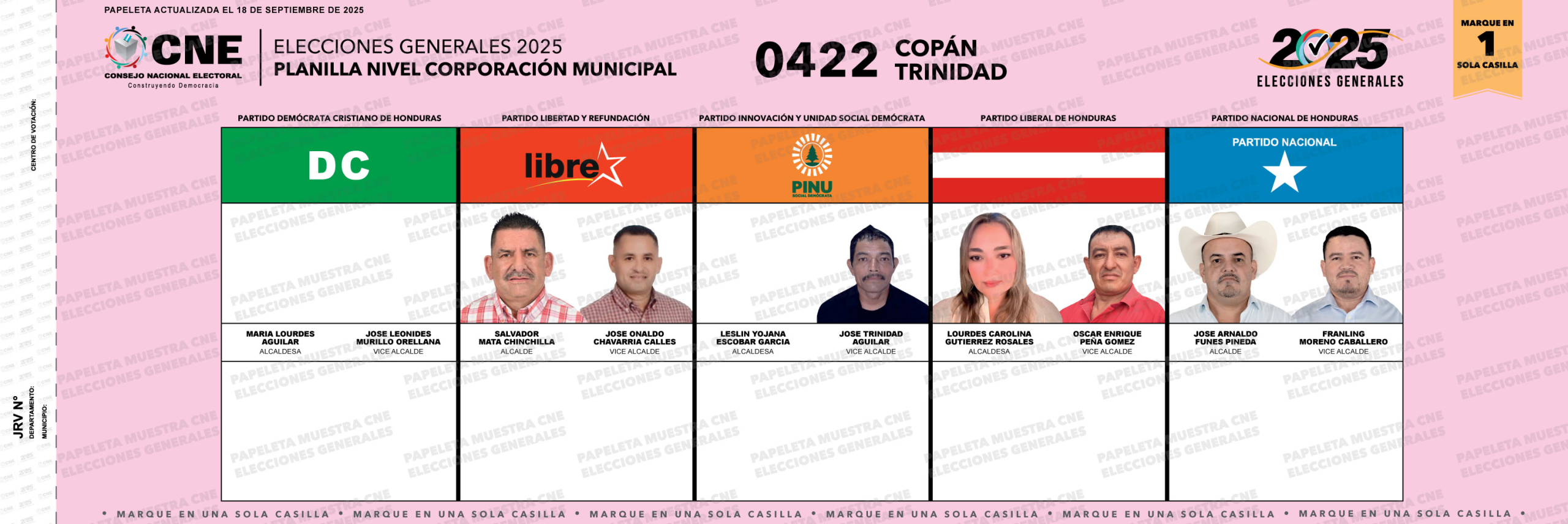 0 Carga electoral Electores habilitados para ejercer el sufragio. Porcentaje de electores que votaron en 2021 (para nivel presidencial): 84.29% La alcaldía fue ganada por el Partido Libre (2021). Papeleta electoral Actualizado al 16 de septiembre. Datos destacados: 0422 Código del municipio.