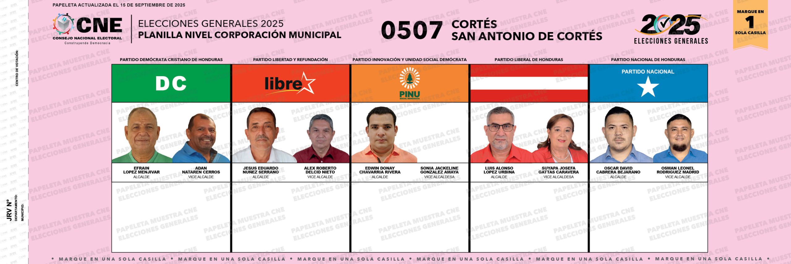 0 Carga electoral Electores habilitados para ejercer el sufragio. Porcentaje de electores que votaron en 2021 (para nivel presidencial): 71.61% La alcaldía fue ganada por el Partido Liberal (2021). Papeleta electoral Actualizado al 16 de septiembre. Datos destacados: 0507 Código del municipio.