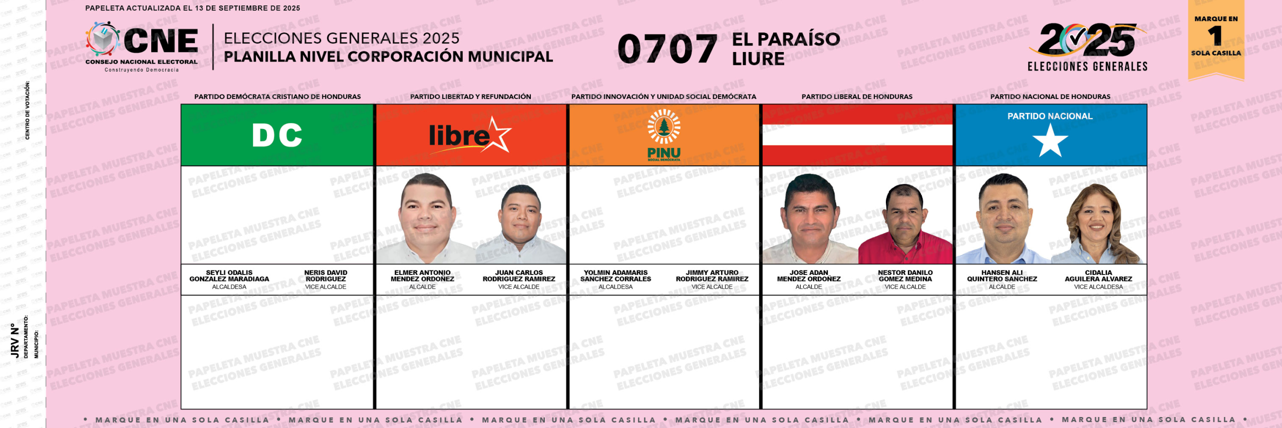 0 Carga electoral Electores habilitados para ejercer el sufragio. Porcentaje de electores que votaron en 2021 (para nivel presidencial): 86.05% La alcaldía fue ganada por el Partido Liberal (2021). Papeleta electoral Actualizado al 16 de septiembre. Datos destacados: 0707 Código del municipio.