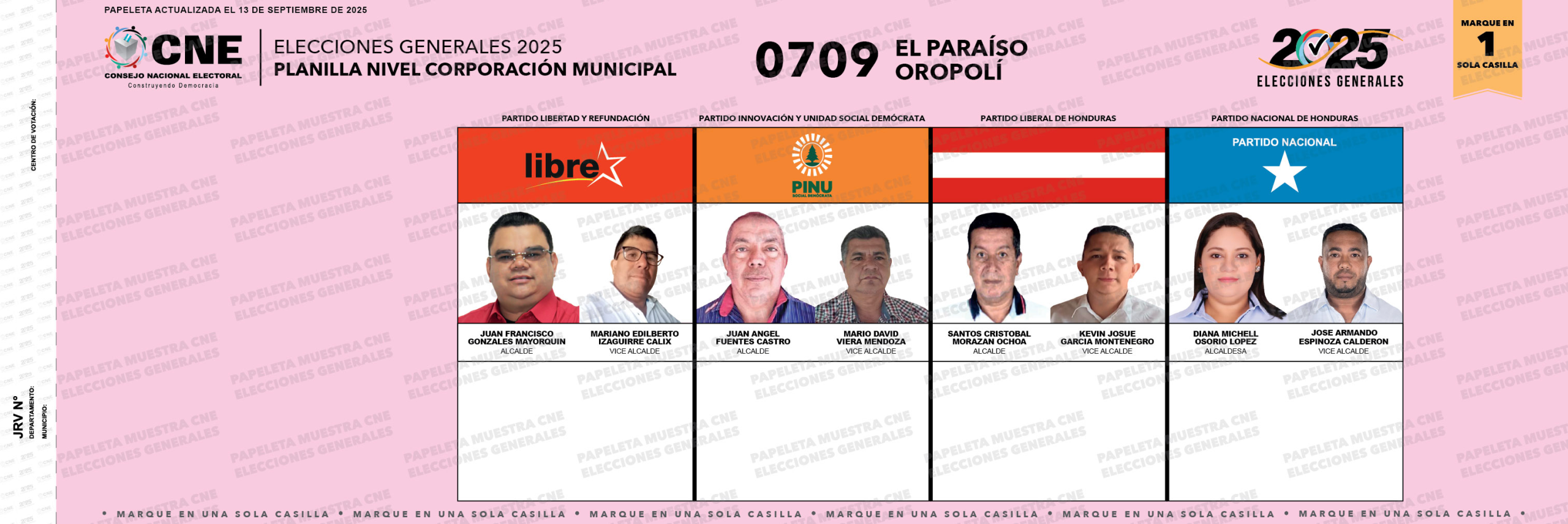 0 Carga electoral Electores habilitados para ejercer el sufragio. Porcentaje de electores que votaron en 2021 (para nivel presidencial): 88.66% La alcaldía fue ganada por el Partido Nacional (2021). Papeleta electoral Disponible cuando el CNE apruebe y publique. Datos destacados: 0709 Código del municipio.