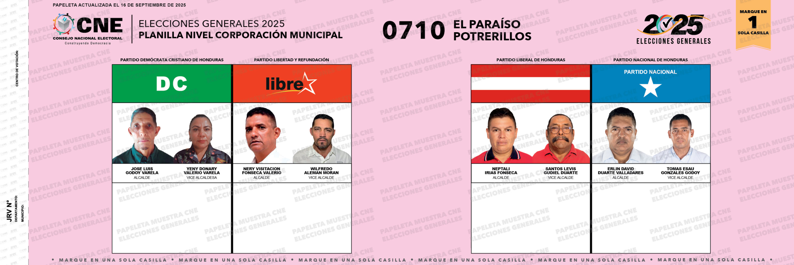 0 Carga electoral Electores habilitados para ejercer el sufragio. Porcentaje de electores que votaron en 2021 (para nivel presidencial): 84.44% La alcaldía fue ganada por el Partido Nacional (2021). Papeleta electoral Actualizado al 16 de septiembre. Datos destacados: 0710 Código del municipio.