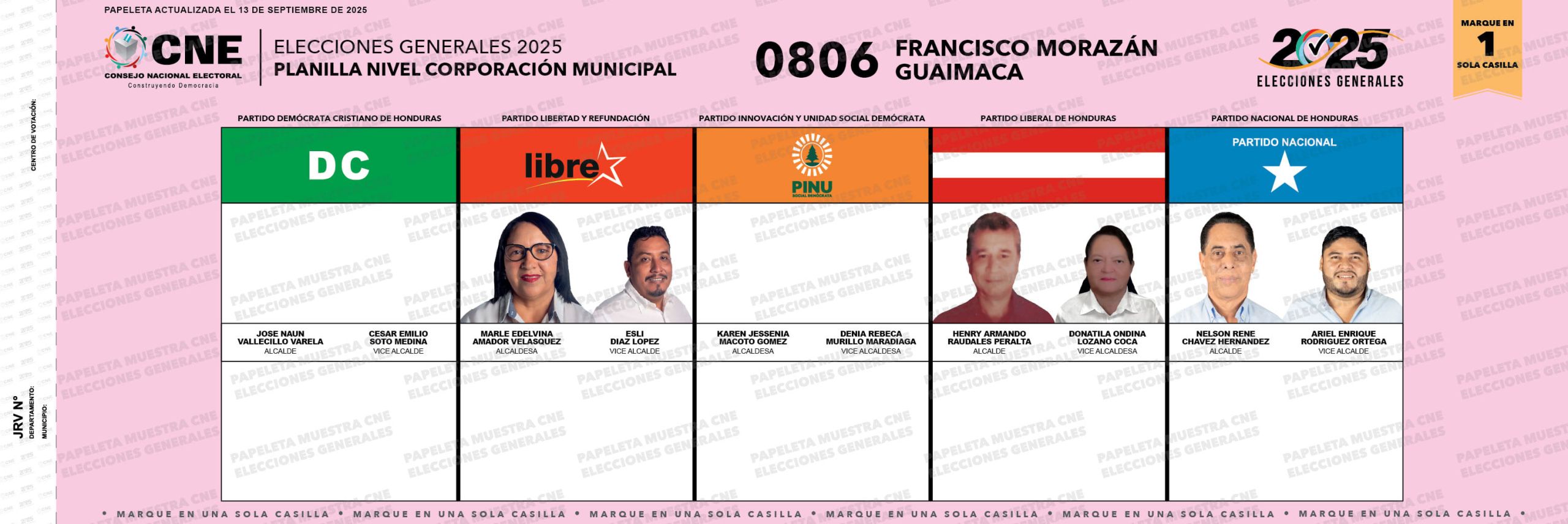 0 Carga electoral Electores habilitados para ejercer el sufragio. Porcentaje de electores que votaron en 2021 (para nivel presidencial): 69.05% La alcaldía fue ganada por el Partido Nacional (2021). Papeleta electoral Actualizado al 16 de septiembre. Datos destacados: 0806 Código del municipio.