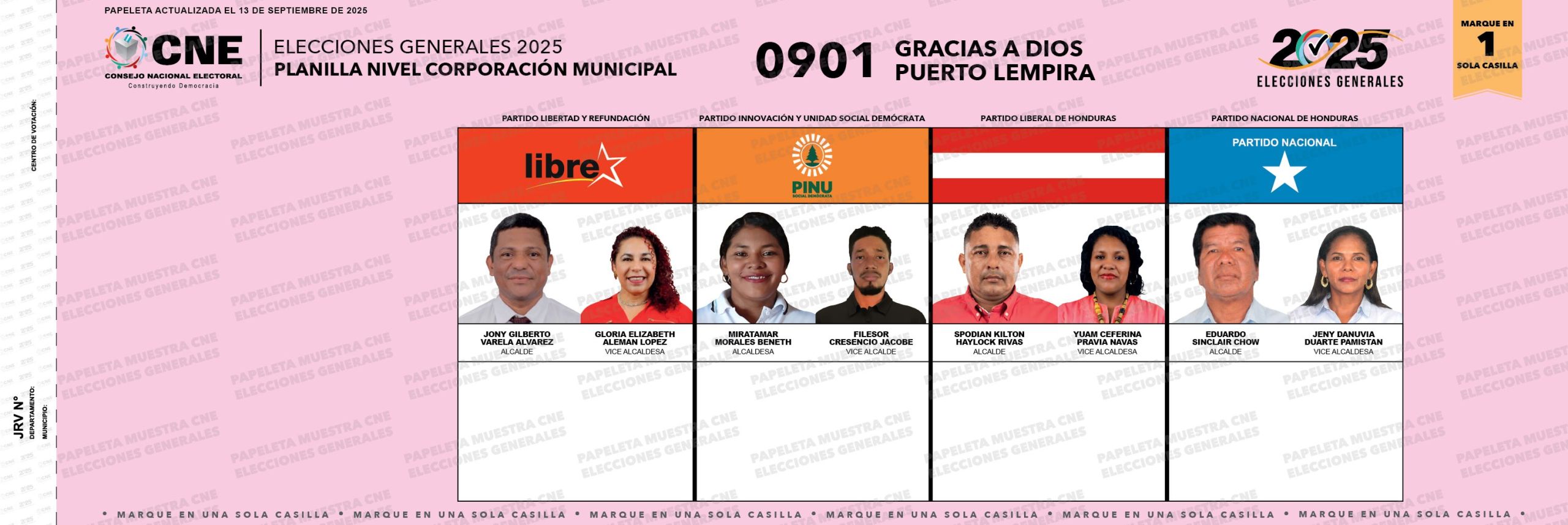 0 Carga electoral Electores habilitados para ejercer el sufragio. Porcentaje de electores que votaron en 2021 (para nivel presidencial): 67.81% La alcaldía fue ganada por el Partido Nacional (2021). Papeleta electoral Actualizado al 13 de septiembre. Datos destacados: 0901 Código del municipio.